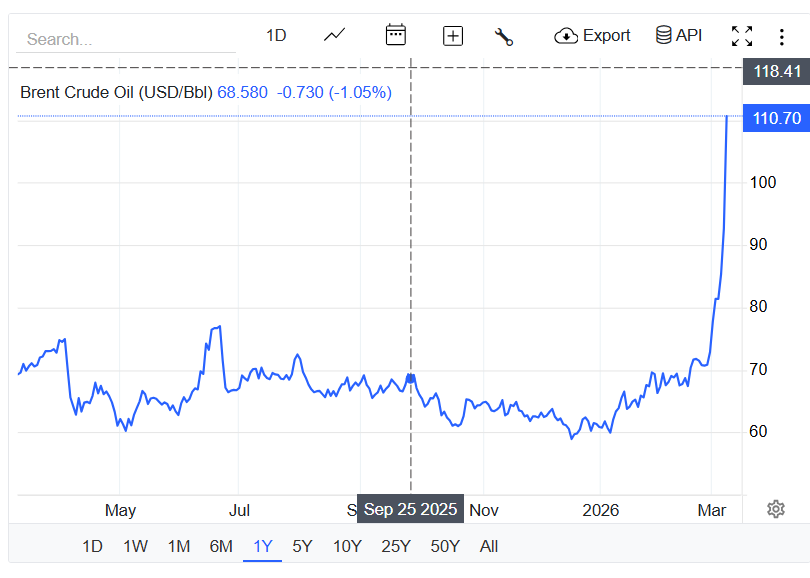 De stijging vertegenwoordigt de grootste eendaagse winst sinds april 2020 en het hoogste prijsniveau sinds juni 2022, waarmee de stijging van vorige week met 27% wordt voortgezet. In Irak is de productie van de drie belangrijkste zuidelijke olievelden met 70% gedaald tot 1,3 miljoen vaten per dag ten opzichte van 4,3 miljoen vaten per dag vóór het conflict, volgens bronnen uit de industrie. Koeweit, de vijfde grootste producent van OPEC, begon zaterdag ook met het verminderen van de productie en heeft overmacht verklaard. Dit volgde op de verminderingen van de LNG-productie uit Qatar vorige week, wat de wereldwijde voorraad verder verscherpte. Analisten verwachten ook mogelijke productieverminderingen uit de VAE en Saoedi-Arabië vanwege snel vullende opslagfaciliteiten. Ondertussen heeft Iran de zoon van wijlen ayatollah Ali Khamenei benoemd tot zijn nieuwe Opperste Leider.
