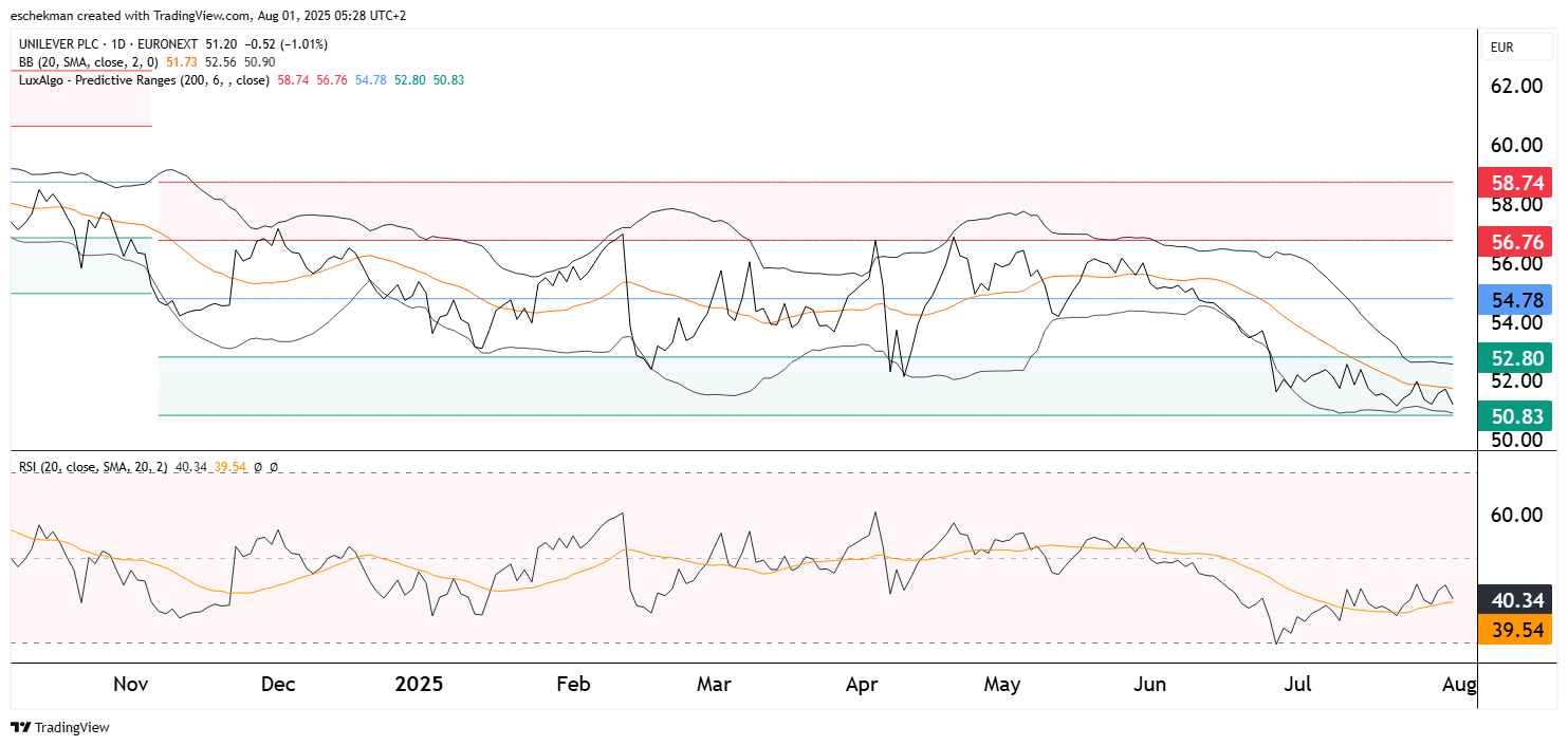 Op 51,20 euro is Unilever charttechnisch watertandend mooi. Belangrijke indicatoren kunnen nauwelijks lager. Wat wil je meer als koopjesjager?