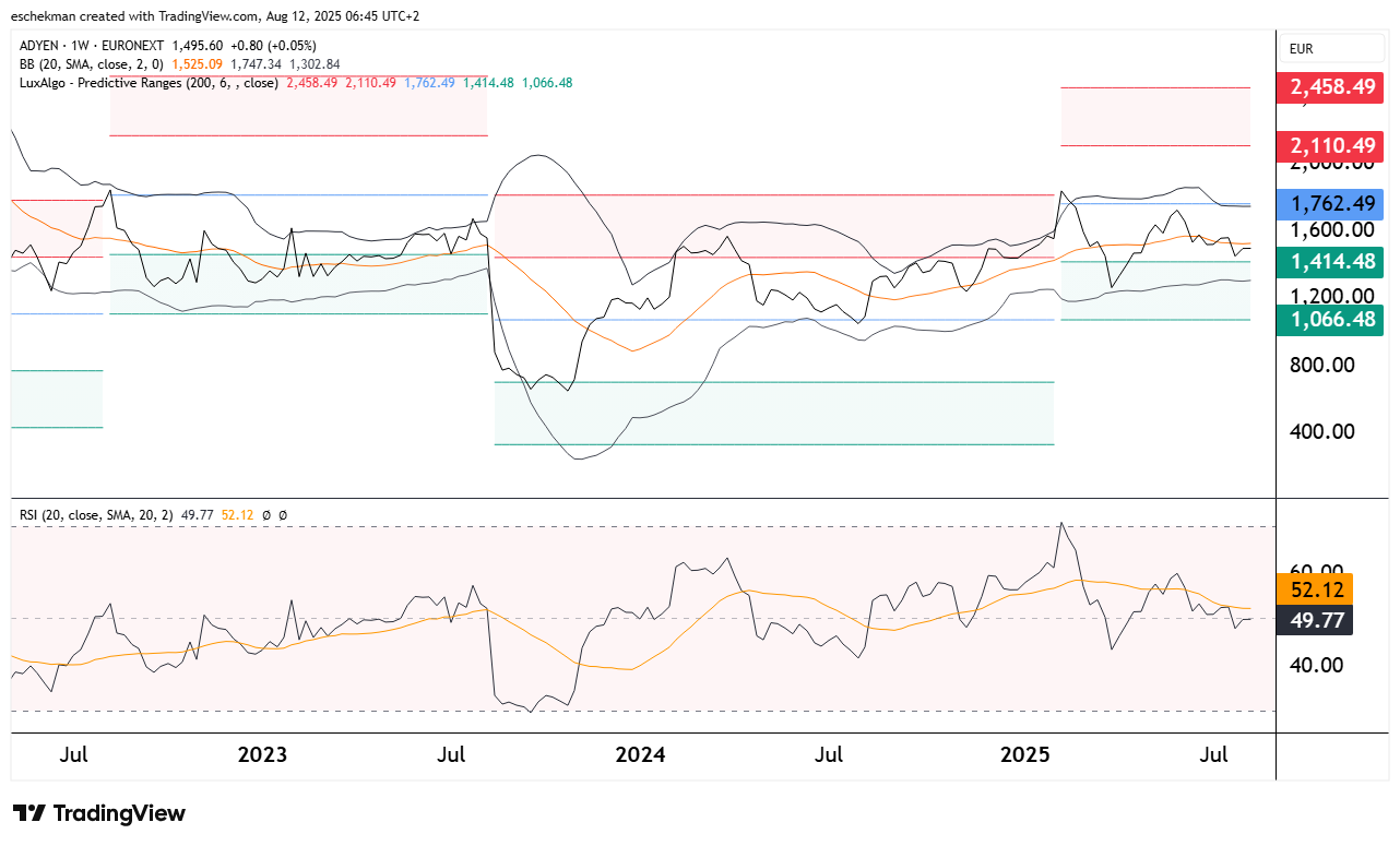 Adyen publiceert deze week de cijfers over het eerst halfjaar. De verwachting is een winst per aandeel van 16,84 euro tegen 12,60 euro vorig jaar.